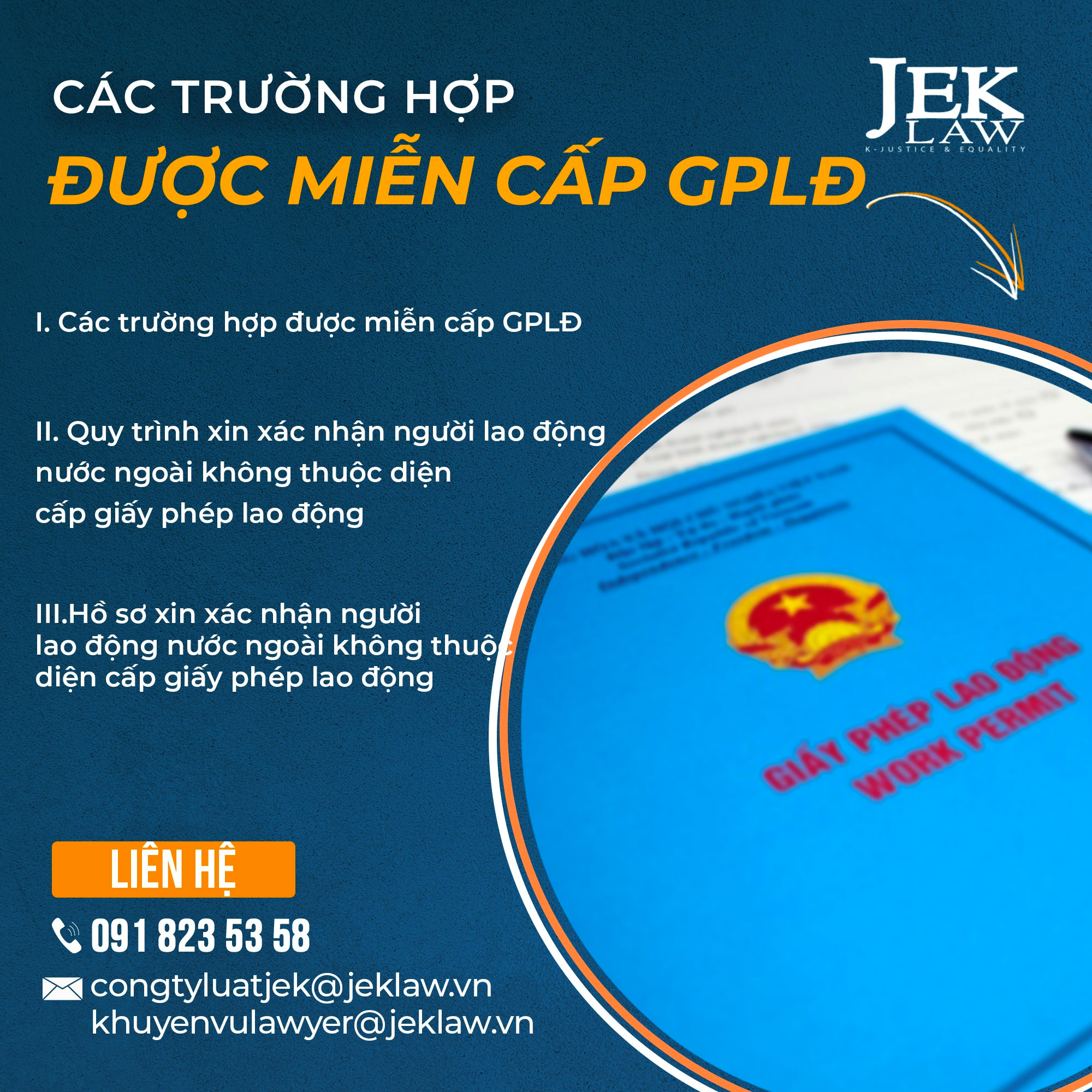 JEK LAWFIRM là đơn vị chuyên cung cấp dịch vụ làm giấy phép lao động, gia hạn giấy phép lao động và xin xác nhận không thuộc diện cấp giấy phép lao động cho người nước ngoài tại Hà Nội đảm bảo linh hoạt, uy tín và đúng quy định pháp luật. Quý khách hàng cần tư vấn chi tiết hoặc sử dụng dịch vụ hãy liên hệ ngay với chúng tôi để được hỗ trợ.